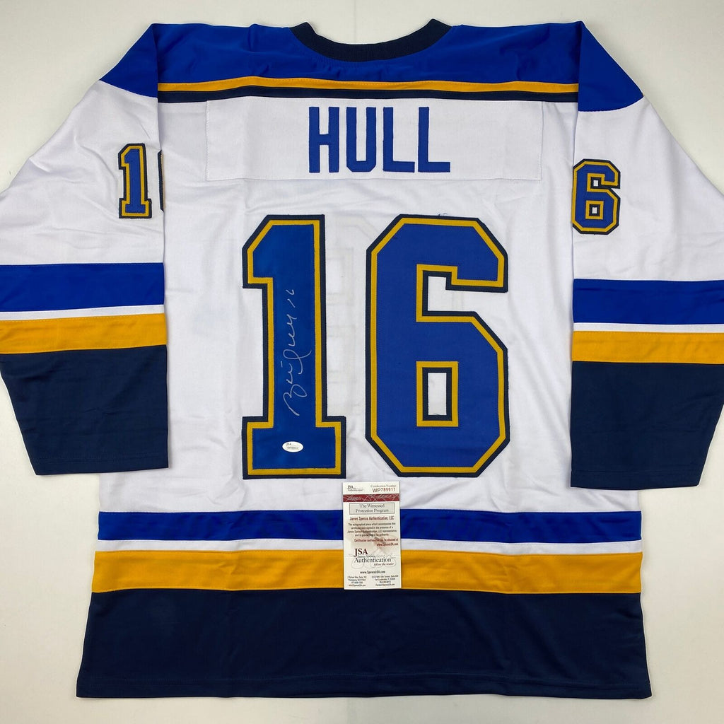 Autographed/Signed Brett Hull St. Louis White Hockey Jersey JSA COA Jersey has no brand names or logos. This is a custom jersey and was not manufactured by or in any manner associated with any professional sports league or manufacturer. This custom jersey carries no professional sports league designation. The item is intended to be an autographed collectible. The custom jersey displays the name and number of the player. This item in no way is affiliated with or connected to any professional sports organization. Size is XL.