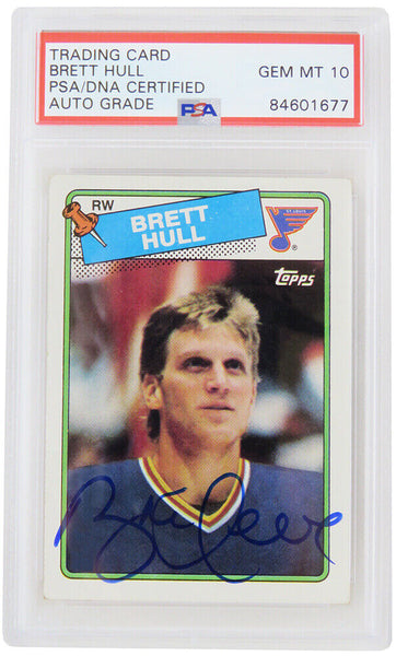 Brett Hull signed St Louis Blues 1988 Topps hockey rookie trading card #66. The card has been authenticated and encapsulated by PSA/DNA and the autograph has been given a GEM Mint 10 auto grade. The authentication number can be verified online. Only the autograph has been graded a 10 by PSA, the card itself is ungraded. The image of the item is a stock photo, as we may have multiples of the item in stock. The Slabbed Card you will receive will be of the card described. (Same grade, Same authentication) You may or may not receive the exact PSA serial number on the slab label shown in image.