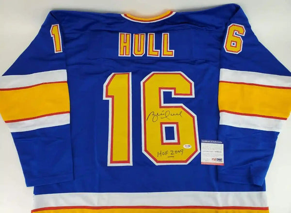 This autographed jersey has been personally hand-signed by Brett Hull of the St. Louis Blues. Hull added the inscription "HOF 2009" along with his signature.This autograph is certified by PSA/DNA (Professional Sports Authenticators). It comes with the numbered hologram and matching Certificate of Authenticity.Custom on-field style jerseys are a more affordable option for autograph seekers. These jerseys do not have any brand name or tags and are made in the Philippines. They feature stitched on names and numbers and are made to look very similar to the on-field jerseys that the players wear. These custom jerseys are very commonly used in the memorabilia industry.