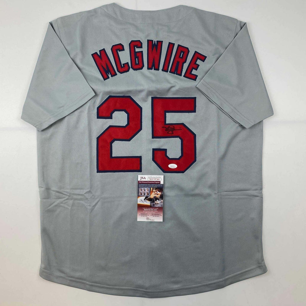 Autographed/Signed Mark McGwire St. Louis Grey Baseball Jersey JSA COA Jersey has no brand names or logos. This is a custom jersey and was not manufactured by or in any manner associated with any professional sports league or manufacturer. This custom jersey carries no professional sports league designation. The item is intended to be an autographed collectible. The custom jersey displays the name and number of the player. This item in no way is affiliated with or connected to any professional sports organization. Size is XL.