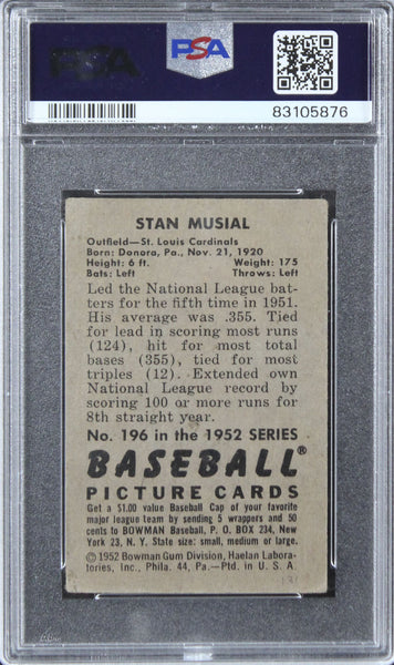 This Autographed Auto Graded Mint 9! 1952 Bowman #196 Card has been Personally Signed by Stan Musial of the St. Louis Cardinals. This item is 100% Authentic, it comes slabbed and authenticated by PSA/DNA. The authenticity can be verified on Professional Sports Authenticator website.