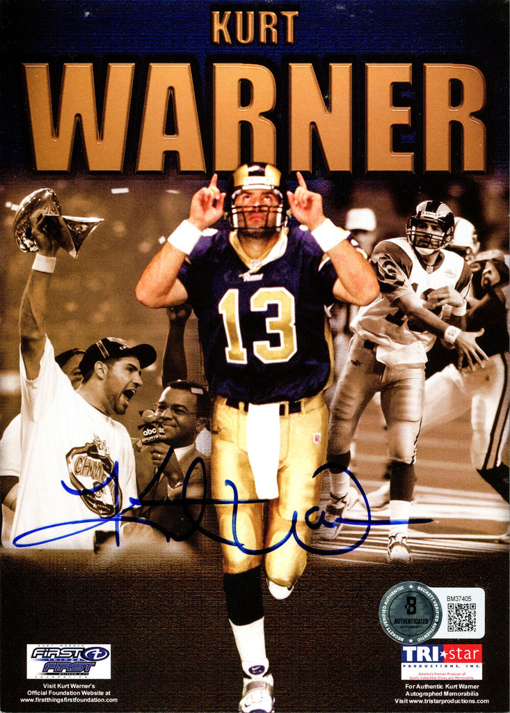 This is a 5x7 Photo that has been hand signed by Kurt Warner. This item has been certified authentic by Beckett Authentication (BAS) and comes with their tamper-proof QR Code sticker that can be verified on beckett-authentication.com.