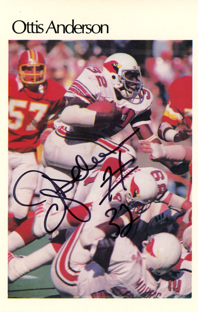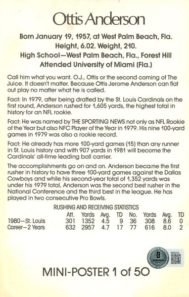 The number in the listing title is just an inventory sku for our records and is not the authentication number. This is the exact item that you will receive so please see pictures for condition. This is a mini poster measuring 8.5" x 5.5" that was personally autographed by Ottis Anderson. Includes a certificate of authenticity from Beckett Authentication Services (BAS) and Denver Autographs.
