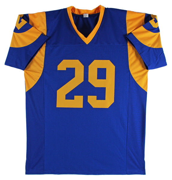 This is a "HOF 99" Authentic Signed Blue Jersey that has been Personally Signed & Autographed by Eric Dickerson of the Los Angeles Rams. This item is 100% Authentic to include a hologram by Beckett Authentication Services. This item will come with the new Beckett Authentication hologram that has a scannable QR code rather than the traditional COA. If you would like to have a COA, you are welcome to reach out to Beckett for a printed certification once you receive your item. This is a BAS Witnessed Protection Program item which means a Beckett Authentication Service representative was present when this item was being signed. This is a stock item. We conducted an autograph signing with Eric Dickerson where multiples of the same item were signed. While the photographs are representative of this item, the size, placement and strength of the signature may vary. Each item is hand signed, therefore, each autograph is unique. This item can be verified through BAS Witnessed. This is a size XL custom stitched non-branded jersey.