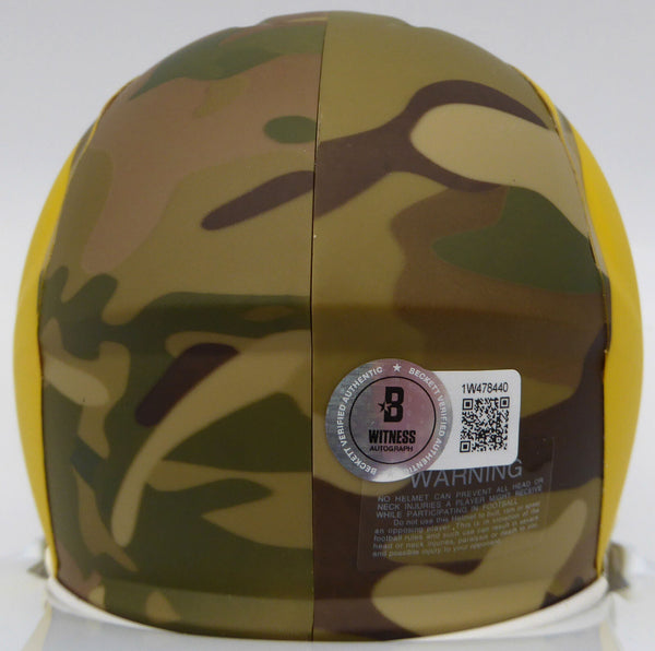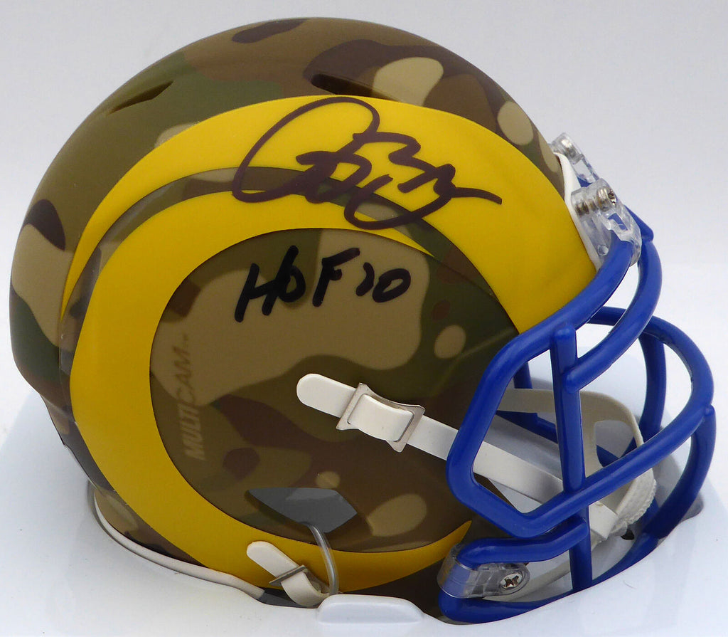 This is a St. Louis Rams Camo Speed Mini Helmet that has been hand signed by Isaac Bruce. Because each Camo helmet is hand-dipped using water-transfer technology there may be slight imperfections. This item was inscribed "HOF 20." This item has been certified authentic by Beckett Authentication (BAS) and comes with their tamper-proof QR Code sticker that can be verified on the Beckett-authentication.com.
