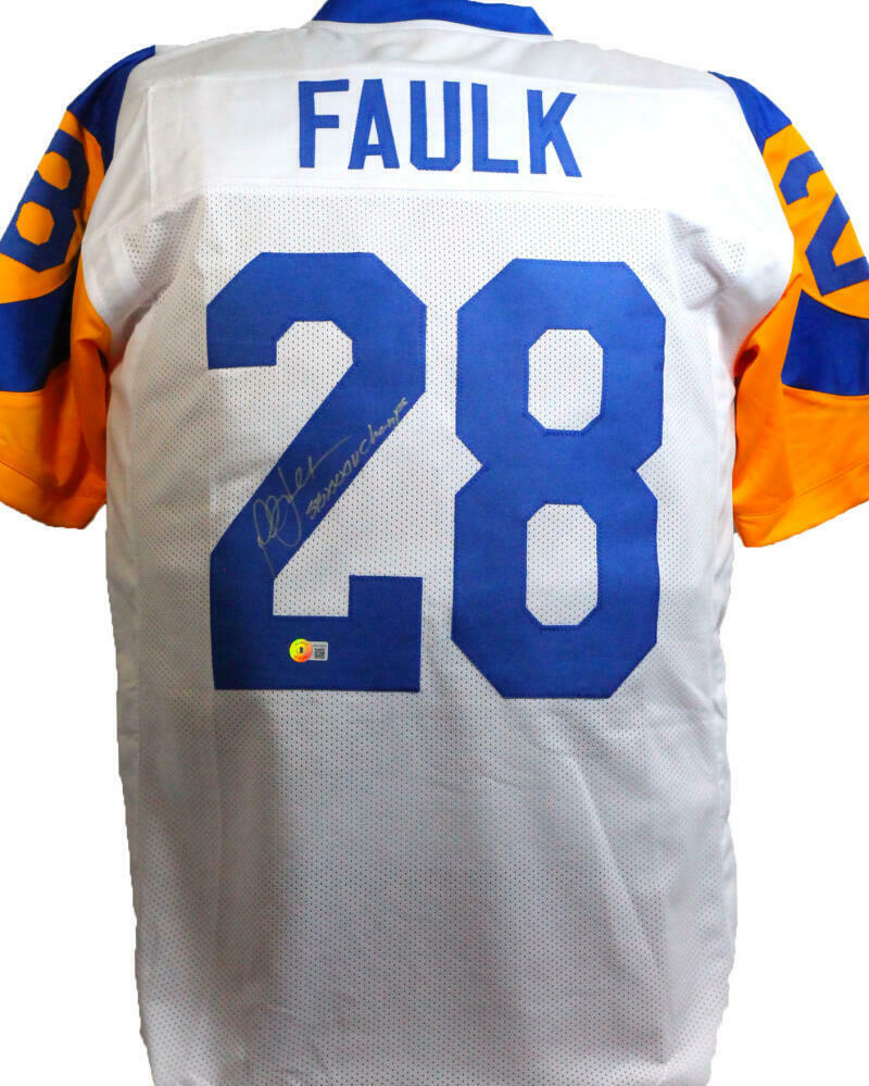 Marshall Faulk Autographed White/Blue Pro Style Jersey w/SB- Beckett W*Silver *2 THIS IS NOT AN NFL JERSEY. THIS HAS NO TAGS, NO LOGOS, NO EMBLEMS. This is a Marshall Faulk of the St. Louis Rams hand autographed custom made (non name brand) authentic style (stitched letters and numbers) jersey with "SB XXXIV Champs" inscription. This item has a Beckett Witnessed Authentication, which comes with a numbered and a matching Beckett Certificate of Authenticity. You can view this item on the Beckett Authentication website, it shows when and where the item was signed. It was signed either at a public autograph appearance or a private signing. Although you may not receive this exact item, the item you receive is virtually identical, brand new, and in great shape. Jersey size is XL.
