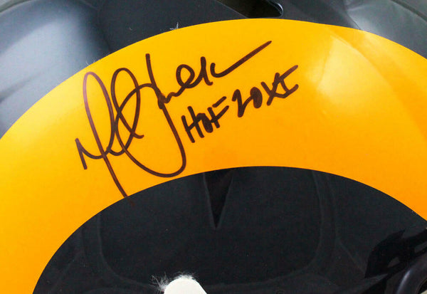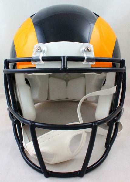 Marshall Faulk Signed Rams 81-99 Speed FS Authentic Helmet w/HOF-Beckett W Hologram *Black This is a Marshall Faulk of the St. Louis Rams hand autographed Riddell Football full size 81-99 throwback Speed Authentic helmet inscribed with "HOF 20XI". This item has a Beckett Witnessed Authentication, which comes with a numbered sticker hologram and a generic Beckett Certificate of Authenticity. You can view this item on the Beckett Authentication website, it shows when and where the item was signed. It was signed either at a public autograph appearance or a private signing. This is a stock photo of the item. Although you may not receive this exact item, the item you receive is virtually identical, brand new, and in great shape.