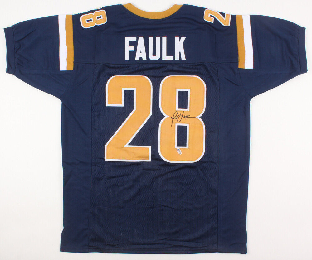 Custom on-field style jersey. Everything is sewn on, size XL. Hand-signed in black felt-tip pen by Marshall Faulk (Rams, Colts, HOF). The lot / autograph(s) includes an official Beckett Authentication Services serially numbered hologram and matching COA for authenticity purposes. The signing of this item was witnessed by Beckett.Authentication: Beckett COA