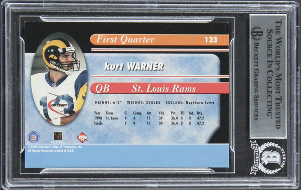 This Autographed 1999 Collector's Edge Odyssey #123 Card has been Personally Signed by Kurt Warner of the St. Louis Rams. This item is 100% Authentic, it comes slabbed and authenticated by Beckett Authentication Services. The authenticity can be verified on Beckett Authentication Services website.