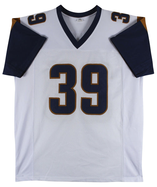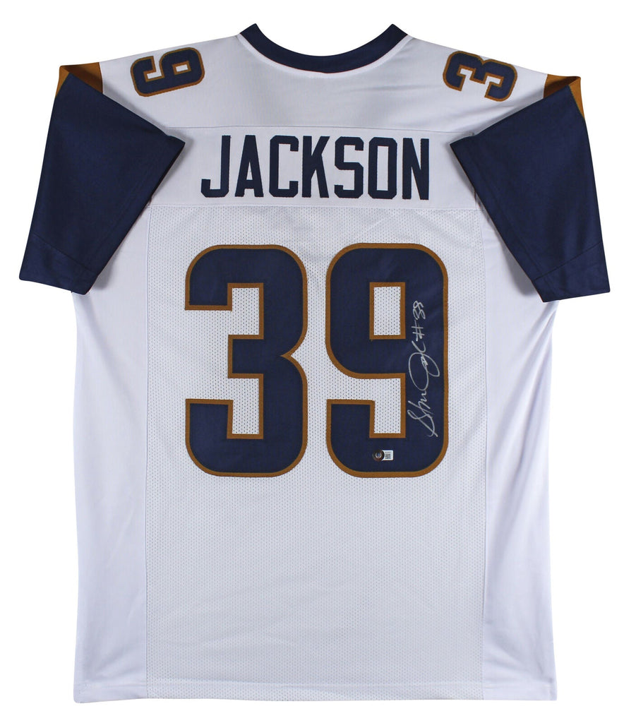 This Autographed White Pro Style Jersey has been Personally Signed by Steven Jackson of the St. Louis Rams. This item is 100% Authentic to include a hologram by Beckett Authentication Services. This item may come with the new Beckett Authentication hologram that has a scannable QR code rather than the traditional COA. If you would like to have a COA, you are welcome to reach out to Beckett for a printed certification once you receive your item. This is a BAS Witnessed Protection Program item which means a Beckett Authentication Service representative was present when this item was being signed. We conducted an autograph signing with Steven Jackson where multiples of the same item were signed. While the photographs are representative of this item, the size, placement and strength of the signature may vary. Each item is hand signed, therefore, each autograph is unique. This item can be verified through BAS Witnessed. This is a X-Large sized, non-branded, custom-stitched Jersey.