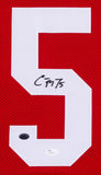 Custom framed display measures 35" x 43" in size. Features a jersey which has been hand-signed in black felt-tip pen by Christian McCaffrey. The autograph includes an official James Spence Authentication (JSA) hologram and matching COA as well as an official Christian McCaffrey for authenticity purposes. Authentication: JSA COA & McCaffrey Hologram