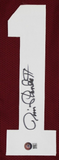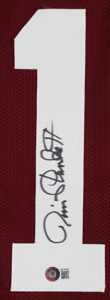 Custom on-field style jersey. Everything sewn on, size XL. Hand-signed and inscribed in black felt-tip pen by Jim Plunkett. The lot / autograph(s) includes an official Beckett Authentication Services serially-numbered hologram and QR Code Card for authenticity purposes. The signing of this item was witnessed by Beckett.Authentication: Beckett Hologram with QR Code card