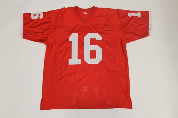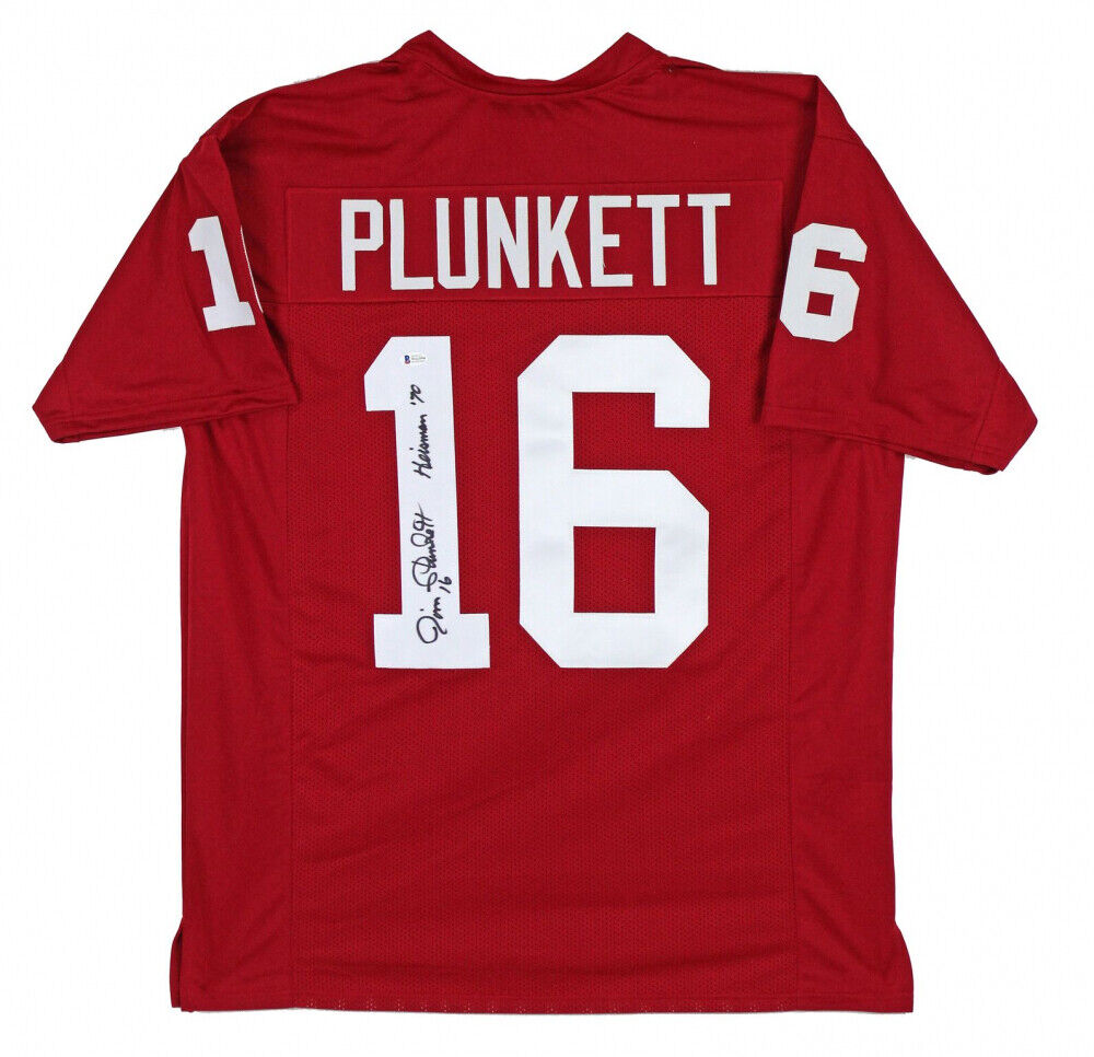 Custom on-field style jersey. Everything sewn on, size XL. Hand-signed and inscribed in black felt-tip pen by Jim Plunkett. The lot / autograph(s) includes an official Beckett Authentication Services serially-numbered hologram and matching COA for authenticity purposes. The signing of this item was witnessed by Beckett.Authentication: Beckett COA