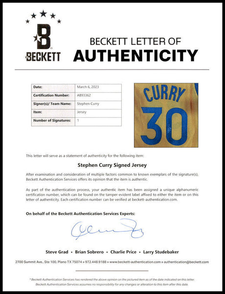 Featured is a Stephen Curry signed custom basketball jersey. This jersey has been hand signed by Curry and comes with the Beckett hologram and letter of authenticity. This jersey has professionally sewn letters and numbers and is size XL. This jersey has no team tags or emblems and is intended as a sports collectible. This jersey would make a great addition to any sports collection!. SPECIFICATIONS Autographed By: Stephen Curry Team: Golden State Warriors Sport: Basketball Authentication: Beckett Grading Services