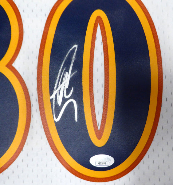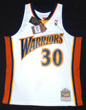This is a White Authentic Mitchell & Ness Golden State Warriors Jersey that has been hand signed by Stephen Curry. The jersey is a Size L. There is an imperfection in the signature as shown. This item has been certified authentic by JSA and comes with their tamper-proof sticker and matching certificate of authenticity.