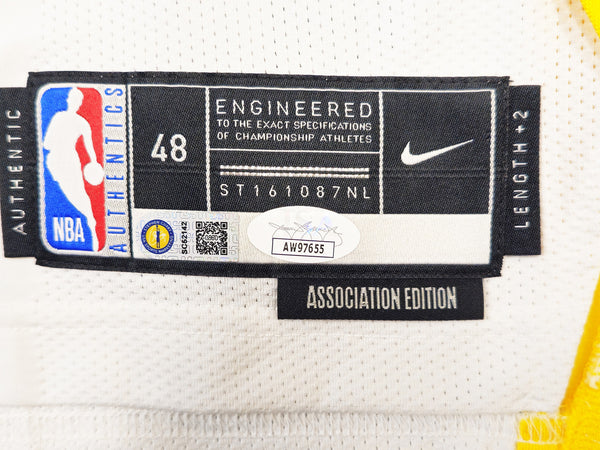 This is a White Nike Golden State Warriors Authentic Association Edition Jersey that has been hand signed by Stephen Curry. This jersey is Size 48. This item has been certified authentic by JSA and comes with their tamper-proof hologram and matching certificate of authenticity.