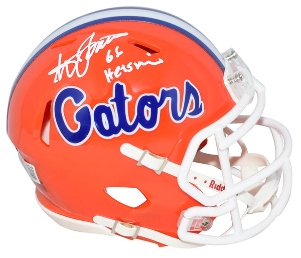 Steve Spurrier, former Heisman Trophy winning quarterback for the Gators, has hand signed this Florida Riddell Speed mini helmet at a private signing. He included the inscription "Heisman 66" with his signature. This item is authenticated by Beckett Authentication Services and was signed in the presence of one of their representatives. Their tamper-evident hologram featuring a QR code and serial number is on the item. The authenticity can be verified online by entering the serial number or scanning the QR code.Item pictured may not be the exact item you will receive. It will be similar quality, and we guarantee your satisfaction.