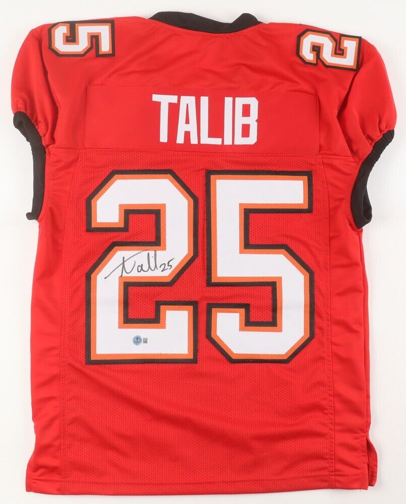Custom on-field style jersey. Everything is sewn on, size XL. Jersey has been hand-signed by Aqib Talib.The autograph includes an official Beckett Authentication Services serially numbered hologram and QR Code card for authenticity purposes. The signing of this item was witnessed by Beckett.Authentication: Beckett Hologram with QR Code card
