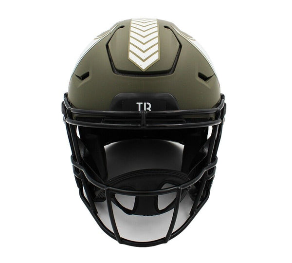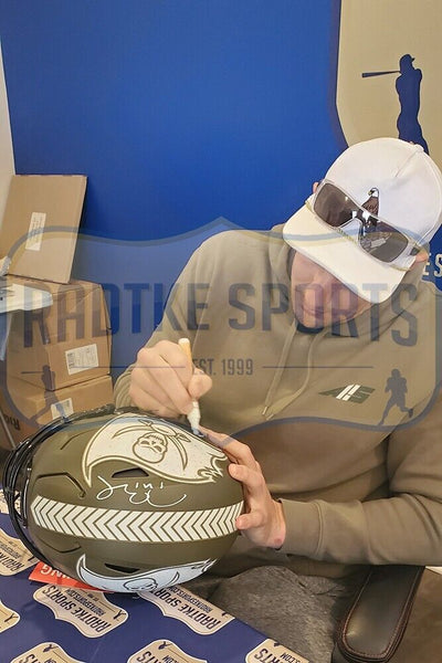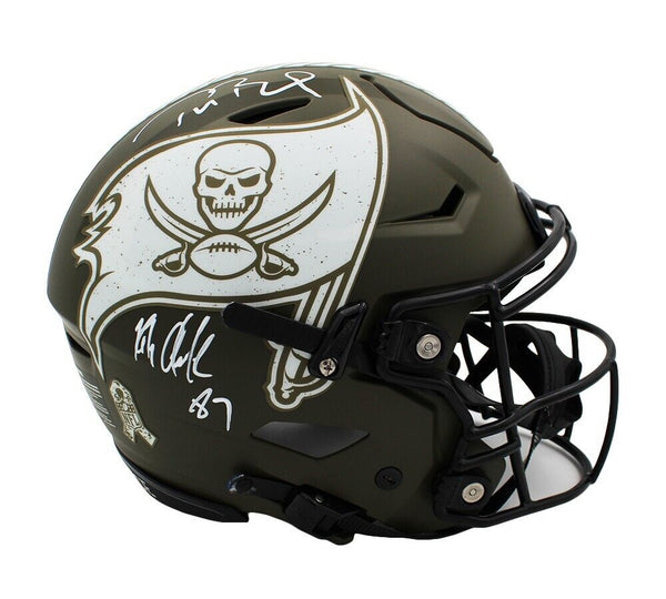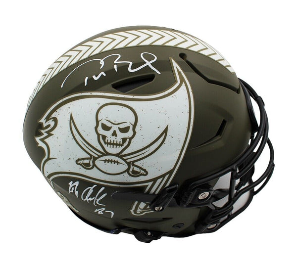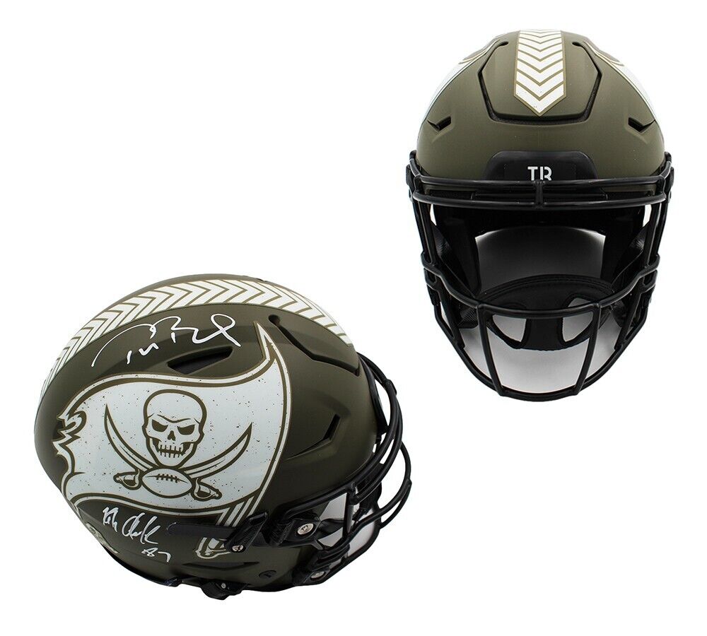 A Tampa Bay Buccaneers Speed Flex Authentic Salute To Service NFL Helmet hand signed by Tom Brady and Rob Gronkowski. The item and signature are in excellent condition. Tom is a quarterback for the Tampa Bay Buccaneers. He has won a record four Super Bowl MVP awards as well as three NFL MVP awards. Rob is a 5x All-Pro First Team, 5x Pro Bowler, and 2x Super Bowl Champion. AUTHENTICATION: Your item is tagged with a Fanatics Authentic Serial Numbered and Databased Hologram and a Rob Gronkowski exclusive SmarTag powered by Prova Technology, which gives you digital access to your items authentication records, which includes a proof picture from the signing.