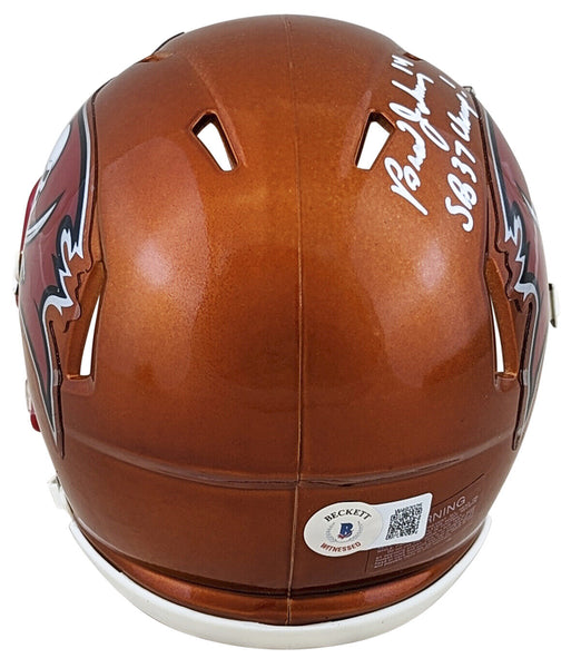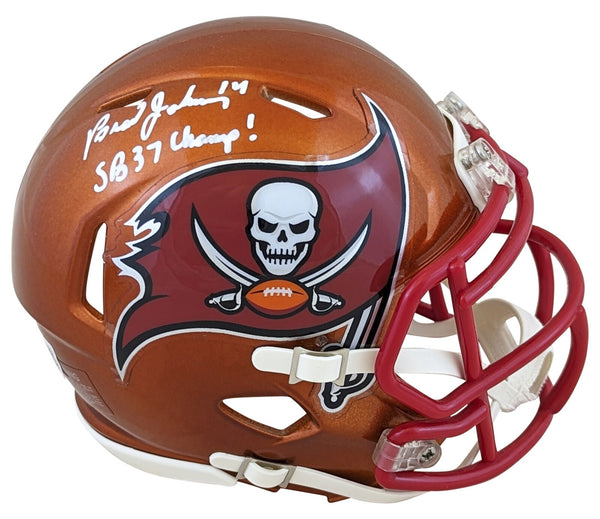 This Autographed Alternate Flash Speed Mini Helmet with the inscription of "SB 37 Champs" has been Personally Signed by Brad Johnson of the Tampa Bay Buccaneers. This item is 100% Authentic to include a hologram by Beckett Authentication Services. This item will come with an affixed Beckett Authentication Services (BAS) authentication sticker, which includes a scannable QR code to verify authenticity. Please note that Beckett no longer provides serial-numbered COA cards, and the attached BAS sticker will serve as the complete authentication for this item. This is a BAS Witnessed Protection Program item which means a Beckett Authentication Service representative was present when this item was being signed. We conducted an autograph signing with Brad Johnson where multiples of the same item were signed. While the photographs are representative of this item, the size, placement and strength of the signature may vary. Each item is hand signed, therefore, each autograph is unique. This item can be verified through BAS Witnessed.