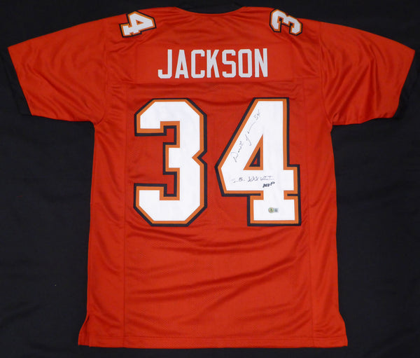 This is a Red Jersey that has been hand signed by Dexter Jackson. This is a custom jersey with no name brand. The approximate size is XL. It has nice sewn in name and numbers. This item was inscribed "S.B. XXXVII MVP." There is an imperfection in the signature as shown. This item has been certified authentic by Beckett Authentication (BAS) and comes with their tamper-proof QR Code hologram that can be verified on the Beckett-authentication.com.