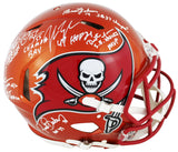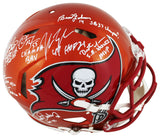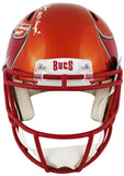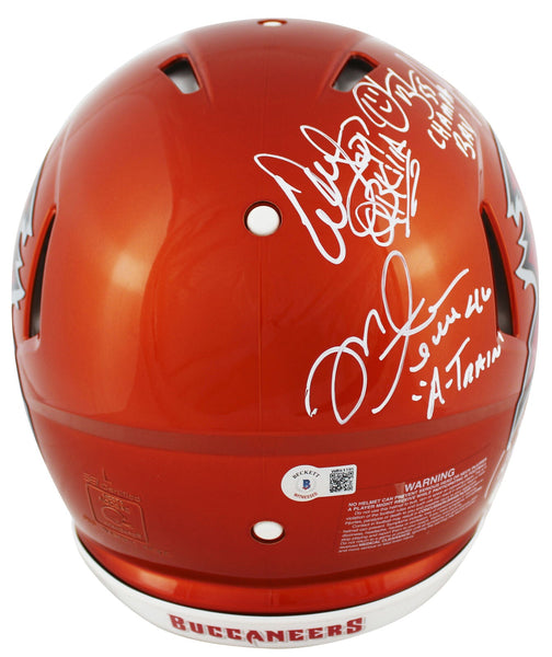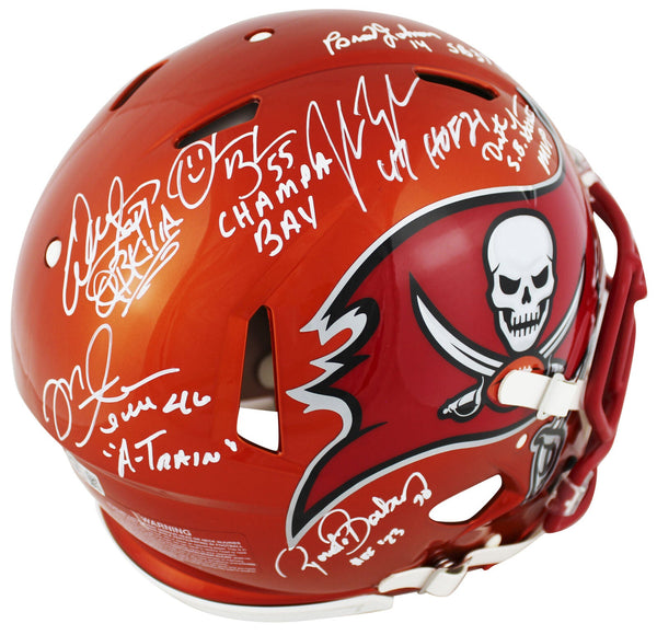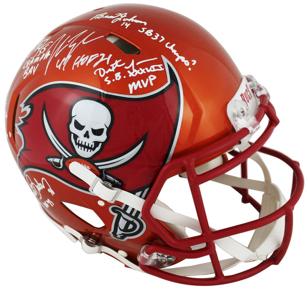 This Autographed Alternate Flash Riddell Authentic Full Size Speed Proline Helmet with the inscription of "A-Train (Alstott), Champa Bay (Brooks), SB 37 Champs! (Johnson), HOF 23 (Barber), SB XXXVII MVP (Jackson), QB Killa (Sapp)" has been Personally Signed by Warren Sapp, Derrick Brooks, John Lynch, Brad Johnson, Dexter Jackson, Ronde Barber & Mike Alstott of the Tampa Bay Buccaneers. This item is 100% Authentic to include a hologram by Beckett Authentication Services. This item will come with an affixed Beckett Authentication Services (BAS) authentication sticker, which includes a scannable QR code to verify authenticity. Please note that Beckett no longer provides serial-numbered COA cards, and the attached BAS sticker will serve as the complete authentication for this item. This is a BAS Witnessed Protection Program item which means a Beckett Authentication Service representative was present when this item was being signed. We conducted an autograph signing with Warren Sapp, Derrick Brooks, John Lynch, Brad Johnson, Dexter Jackson, Ronde Barber & Mike Alstott where multiples of the same item were signed. While the photographs are representative of this item, the size, placement and strength of the signature may vary. Each item is hand signed, therefore, each autograph is unique. This item can be verified through BAS Witnessed.