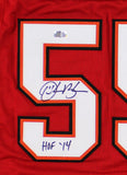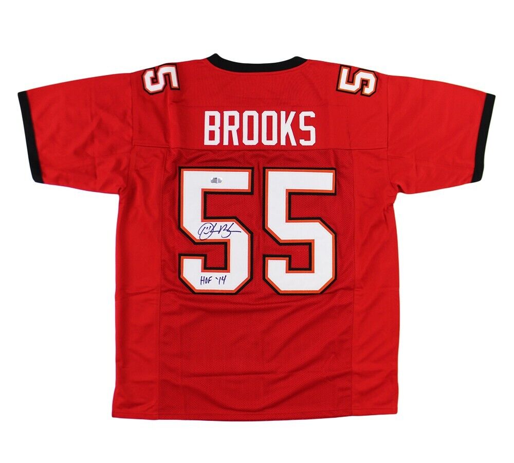 A Tampa Bay Custom Red Jersey hand signed by Derrick Brooks. The item and signature are in excellent condition. In addition to signing his name, Derrick also inscribed "HOF 14" to the item. Derrick is an 11x Pro Bowler, 9x All Pro and a Super Bowl Champion. - AUTHENTICATION: The item is accompanied by a Certificate of Authenticity - Serial Numbered and Databased Hologram - Photo of Derrick from the signing