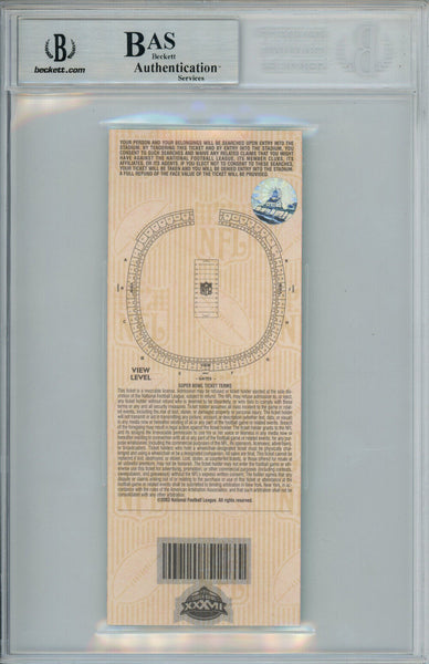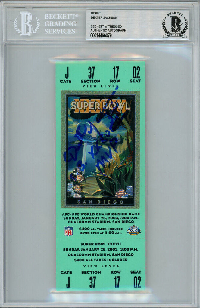 Dexter Jackson Signed Super Bowl XXXVII Full Ticket Stub MVP Beckett Slab 38634 The number in the listing title is just an inventory sku for our records and is not the authentication number. This is the exact item that you will receive so please see pictures for conditiond. This is a full ticket stub that was personally autographed by Dexter Jackson with SB MVP inscription. This has been professionally slabbed by Beckett Authentication Services (BAS) and includes a certificate of authenticity from Denver Autographs.