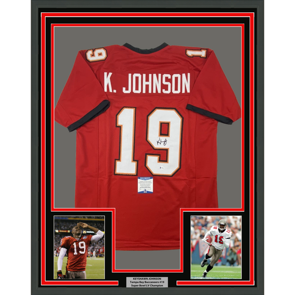FRAMED Autographed/Signed KEYSHAWN JOHNSON 33x42 Red Football Jersey Beckett COA