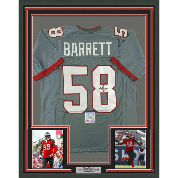 FRAMED Autographed/Signed SHAQUIL SHAQ BARRETT 33x42 Tampa Bay Jersey PSA COA The item is professionally framed & matted with two 8x10 photos, measures 33"x42" and is ready to be hung in your man cave! NOTE: COA card will be mounted on the back of the frame, not inside it on top of the jersey as seen in the picture.