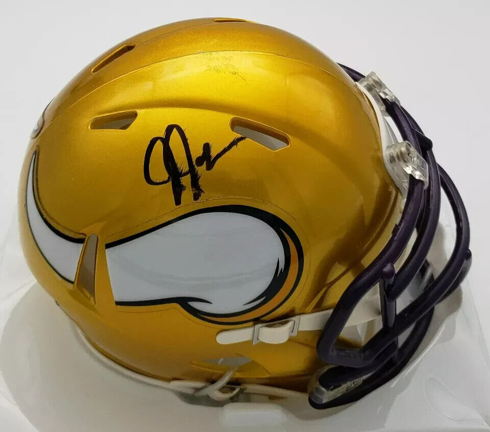 This autographed Riddell Flash Alternate Speed mini helmet has been personally hand-signed by Justin Jefferson of the Minnesota Vikings.Note: See photo for minor signature imperfections.This autograph is certified by Beckett Authentication Services (BAS) Witness Certification. That means that a Beckett representative was present when this item was signed. It comes with the numbered authentication hologram with a QR Code Card that verifies the authentication on the Beckett website.Authentication: Beckett Hologram with QR Code Card