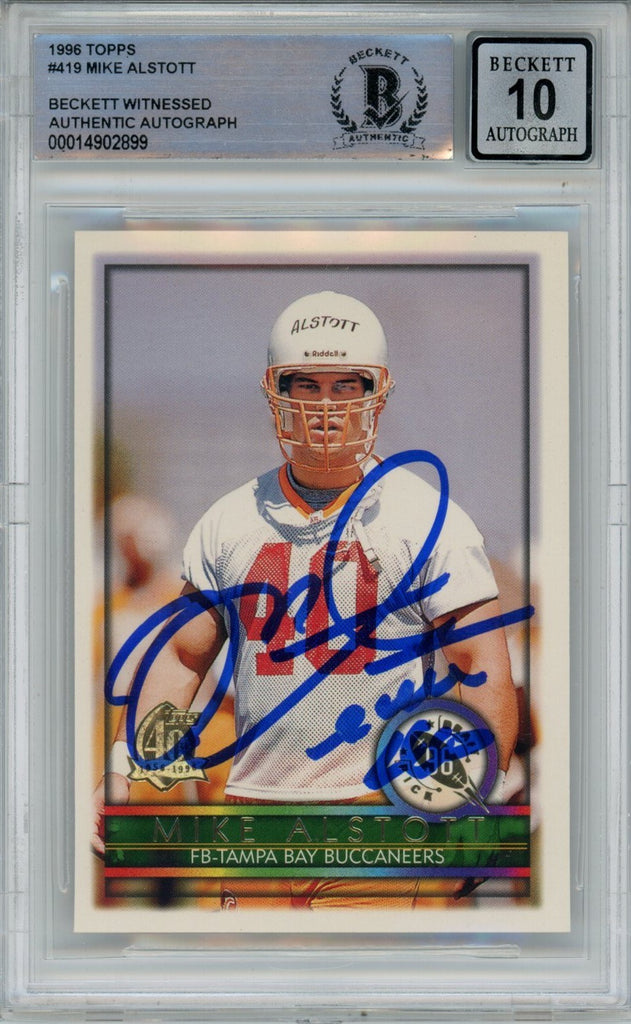 The number in the listing title is just an inventory sku for our records and is not the authentication number. The item pictured is the exact item you will receive, please see photos for condition. This is a Tampa Bay Buccaneers 1996 Topps #419 Slabbed Trading Card that was personally autographed by Mike Alstott. Includes a certificate of authenticity from Beckett Authentication Services (BAS) and Denver Autographs.