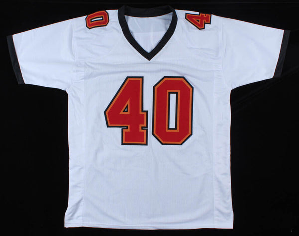 Custom on-field style jersey. Everything is sewn on, size XL. Hand-signed and inscribed in silver paint pen by Mike Alstott. The lot / autograph(s) includes an official Beckett Authentication Services serially numbered hologram for authenticity purposes. The signing of this item was witnessed by Beckett.Authentication: Beckett Hologram