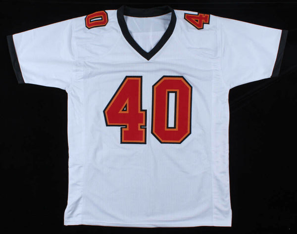 Custom on-field style jersey. Everything is sewn on, size XL. Hand-signed and inscribed in silver paint pen by Mike Alstott. The lot / autograph(s) includes an official Beckett Authentication Services serially numbered hologram and matching COA for authenticity purposes. The signing of this item was witnessed by Beckett.Authentication: Beckett COA