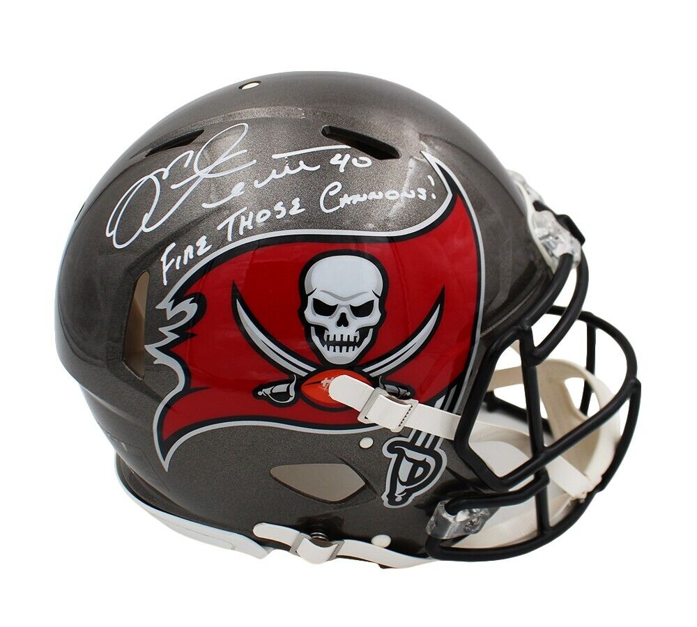 A Tampa Bay Buccaneers Speed Authentic NFL Helmet hand signed by Mike Alstott. The item and signature are in excellent condition. In addition to signing his name, Mike also inscribed "Fire Those Cannons" on the item. Mike is a 6x Pro Bowler, Super Bowl Champion and is a member of the Tampa Bay Buccaneers Ring of Honor. AUTHENTICATION: The item is accompanied by a Beckett Serial Numbered and Databased Hologram
