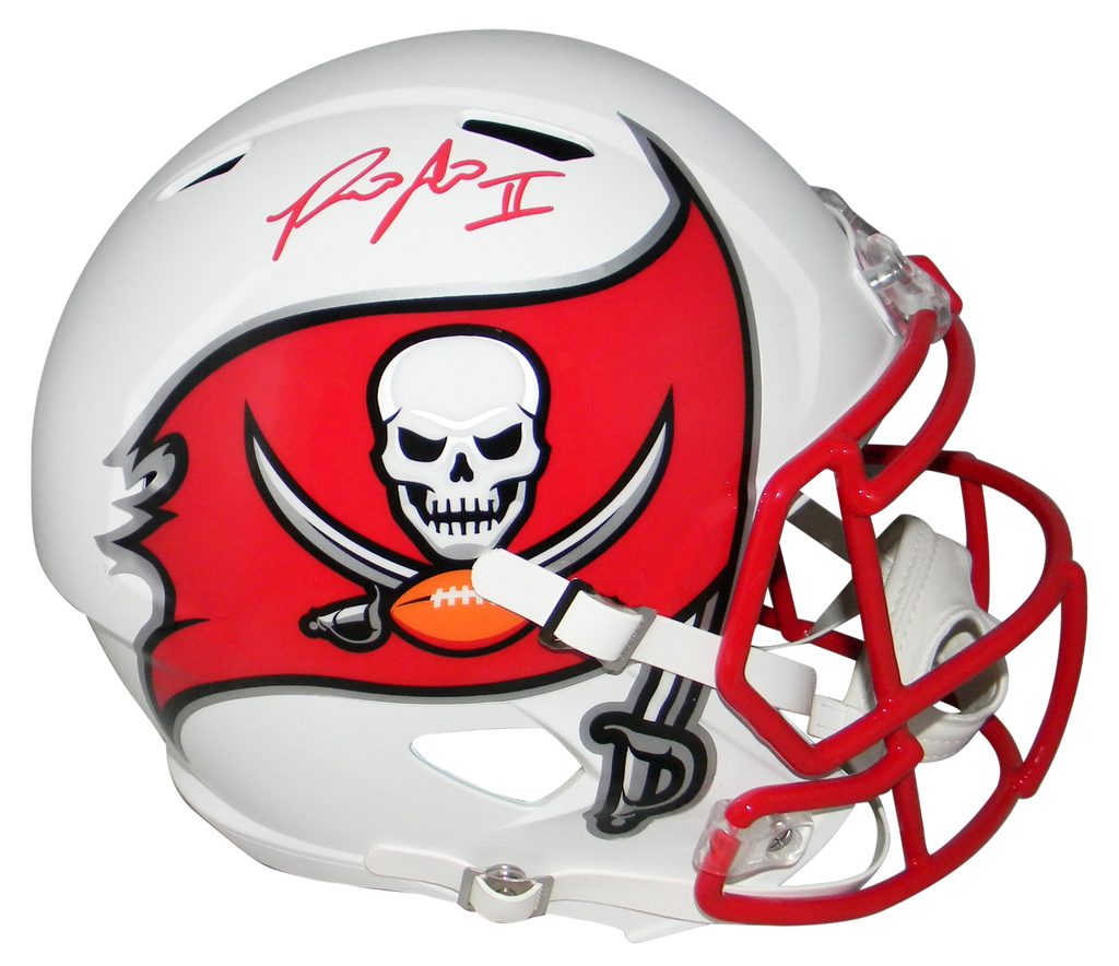Ronald Jones II, running back for the Tampa Bay Buccaneers, has hand signed this Bucs Riddell Speed Flat White full-size replica helmet at a private signing. This item comes with a certificate of authenticity (COA) from Beckett Authentication Services and was signed in the presence of one of their representatives. You will receive a serial-numbered COA along with a matching serial-numbered sticker on the helmet. The authenticity can be verified online by entering the serial number.Item pictured may not be the exact item you will receive. It will be similar quality, and we guarantee your satisfaction.