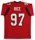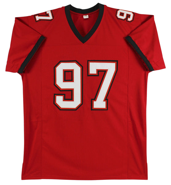 This Autographed Red Throwback Pro Style Jersey has been Personally Signed by Simeon Rice of the Tampa Bay Buccaneers. This item is 100% Authentic to include a hologram by Beckett Authentication Services. This item will come with the new Beckett Authentication hologram that has a scannable QR code rather than the traditional COA. If you would like to have a COA, you are welcome to reach out to Beckett for a printed certification once you receive your item. This is a BAS Witnessed Protection Program item which means a Beckett Authentication Service representative was present when this item was being signed. We conducted an autograph signing with Simeon Rice where multiples of the same item were signed. While the photographs are representative of this item, the size, placement and strength of the signature may vary. Each item is hand signed, therefore, each autograph is unique. This item can be verified through BAS Witnessed. This is a X-Large sized, non-branded, custom-stitched Jersey.
