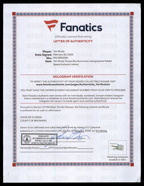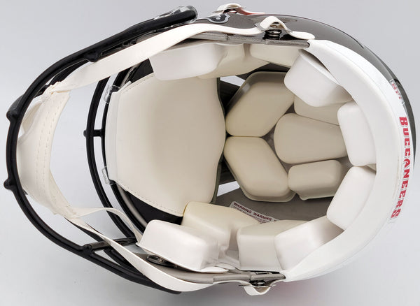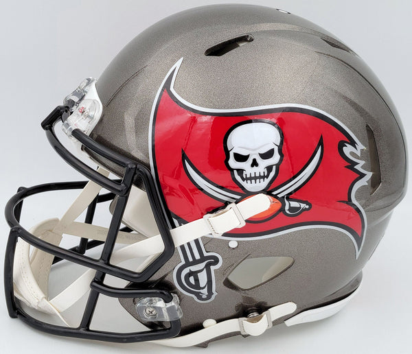 This is a Tampa Bay Buccaneers Gray Full Size Authentic Speed Helmet that has been hand signed by Tom Brady. This item has been certified authentic by Fanatics and comes with their tamper-proof sticker and matching full-page letter of authenticity.