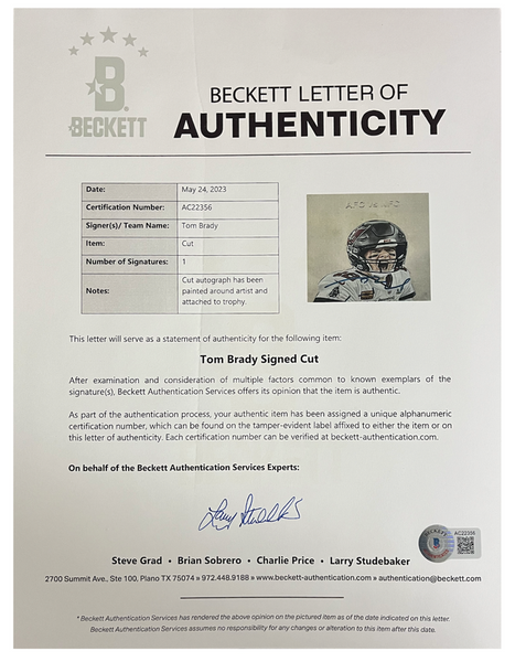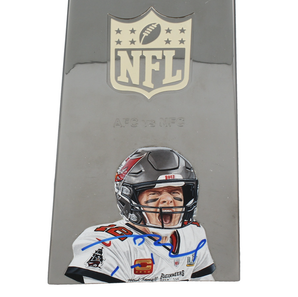 Tom Brady was drafted in the sixth round 199th overall in the 2000 NFL Draft by the New England Patriots. Backing up Drew Bledsoe there wasn't much of a chance for Brady to play until Bledsoe got hurt and Brady took over control. Since becoming the Patriots starter in 2001 the Michigan grad has led his teams to 8 Super Bowls (winning seven of them and was MVP in five of them). Besides the Super Bowls Brady has been to the Pro Bowl, won the NFL MVP and Offensive MVP on different occasions, was awarded the Comeback Player of the Year award, and broke the all-time touchdown passes in a single season. This full size replica Vince Lombardi trophy signed by Tom Brady has been authenticated by Beckett and includes their hologram and certificate of authenticity. This trophy includes a hand painted limited edition image of Tom Brady.This trophy is limited to just 12 and you are bidding on number "1" from the edition.This trophy was made to the exact same measurements as an actual Lombardi trophy. Like the Lombardi trophy, it measures 21 inches high and just over 9 pounds. Like the Lombardi trophy, this is made of high quality polished metal. Made in the USA Personally Autographed by Tom Brady Includes tamper-evident hologram to ensure authenticity