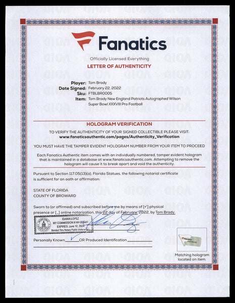 This is an Official NFL Leather SB XXXVIII Logo Football that has been hand signed by Tom Brady. Please note, the silver ink on the signature is not fully dry and the signature is delicate to touch. This item has been certified authentic by Fanatics and comes with their tamper-proof sticker and matching full-page letter of authenticity.