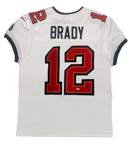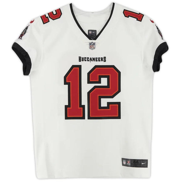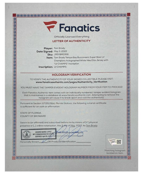 This Nike white Tampa Bay Buccaneers authentic Elite jersey has been personally hand-signed by Tom Brady with the inscription "SB LV Champs." It is officially licensed by the National Football League and comes with an individually numbered, tamper-evident hologram from Fanatics Authentic. To ensure authenticity, the hologram can be reviewed online. This process helps to ensure that the product purchased is authentic and eliminates any possibility of duplication or fraud.