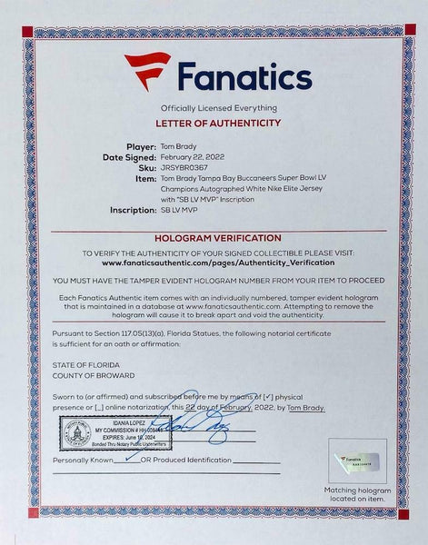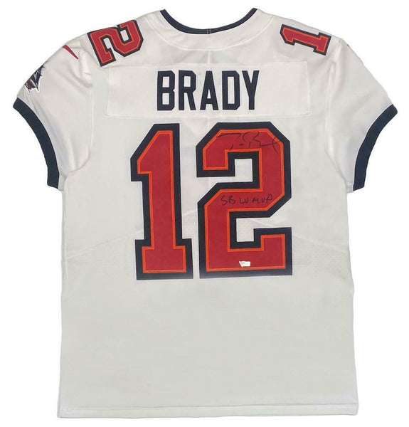 This Nike white Tampa Bay Buccaneers authentic Elite jersey has been personally hand-signed by Tom Brady with the inscription "SB LV MVP." It is officially licensed by the National Football League and comes with an individually numbered, tamper-evident hologram from Fanatics Authentic. To ensure authenticity, the hologram can be reviewed online. This process helps to ensure that the product purchased is authentic and eliminates any possibility of duplication or fraud.