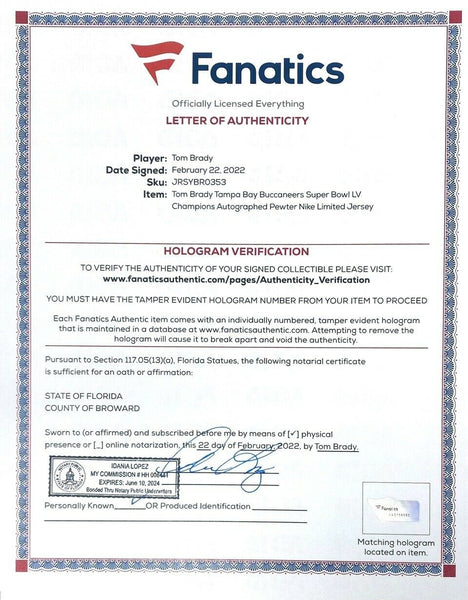 This nike limited jersey has been personally hand-signed by tom brady. it is officially licensed by the national football league and comes with an individually numbered, tamper-evident hologram from fanatics authentic. to ensure authenticity, the hologram can be reviewed online. this process helps to ensure that the product purchased is authentic and eliminates any possibility of duplication or fraud.