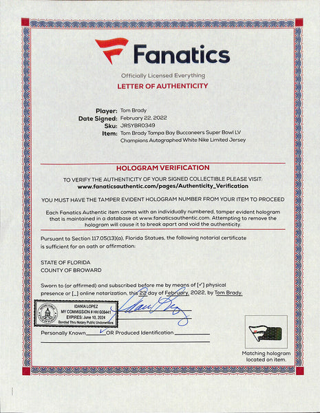 Featured is a Tom Brady signed Tampa Bay Buccaneers white Nike limited football jersey. This jersey was hand signed by Tom Brady and authenticated by Fanatics authentication services. Included with the jersey is a Fanatics hologram and letter of authentication. This jersey would make a great addition to any sports memorabilia collection.. SPECIFICATIONS Autographed By: Tom Brady Team: Tampa Bay Buccaneers Sport: Football Authentication: Fanatics Authentic