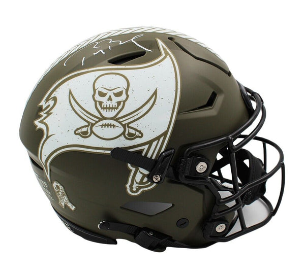 A Tampa Bay Buccaneers Speed Flex Authentic Salute to Service NFL Helmet hand signed by Tom Brady. The item and signature are in excellent condition. Tom is a quarterback for the Tampa Bay Buccaneers. He spent the first 20 seasons of his career with the New England Patriots, playing in nine Super Bowls and winning six of them, both of which are the most of any player in NFL history. He has won a record four Super Bowl MVP awards as well as three NFL MVP awards. AUTHENTICATION: The item is accompanied by a Fanatics Authentic Serial Numbered & Databased Hologram