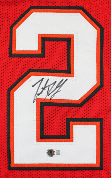 This Autographed Red Pro Style Jersey has been Personally Signed by Trent Dilfer of the Tampa Bay Buccaneers. This item is 100% Authentic to include a hologram by Beckett Authentication Services. This item will come with an affixed Beckett Authentication Services (BAS) authentication sticker, which includes a scannable QR code to verify authenticity. Please note that Beckett no longer provides serial-numbered COA cards, and the attached BAS sticker will serve as the complete authentication for this item. This is a BAS Witnessed Protection Program item which means a Beckett Authentication Service representative was present when this item was being signed. We conducted an autograph signing with Trent Dilfer where multiples of the same item were signed. While the photographs are representative of this item, the size, placement and strength of the signature may vary. Each item is hand signed, therefore, each autograph is unique. This item can be verified through BAS Witnessed. This is a X-Large sized, non-branded, custom-stitched Jersey.