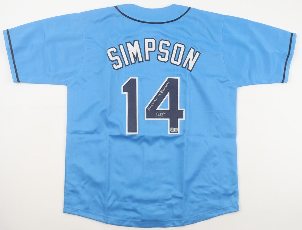 Custom on-field style jersey. Everything sewn on, size XL. Hand-signed and inscribed by Chandler Simpson.The autograph(s) includes an official Beckett Authentication Service (BAS) scannable hologram and QR Code Card for authenticity purposes.Authentication: Beckett scannable Hologram with QR Code Card