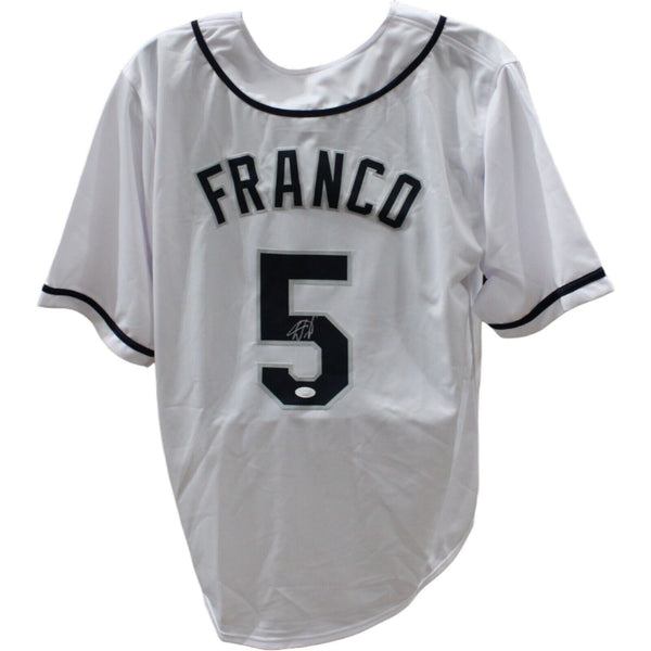 The number in the listing title is just an inventory sku for our records and is not the authentication number. The item pictured is the exact item you will receive, please see photos for condition. This is a Pro Style White Jersey with sewn on numbers that was personally autographed by Wander Franco. Includes a certificate of authenticity from James Spence Authentication (JSA) and Denver Autographs.FREE SHIPPING within the USA on orders over $10!