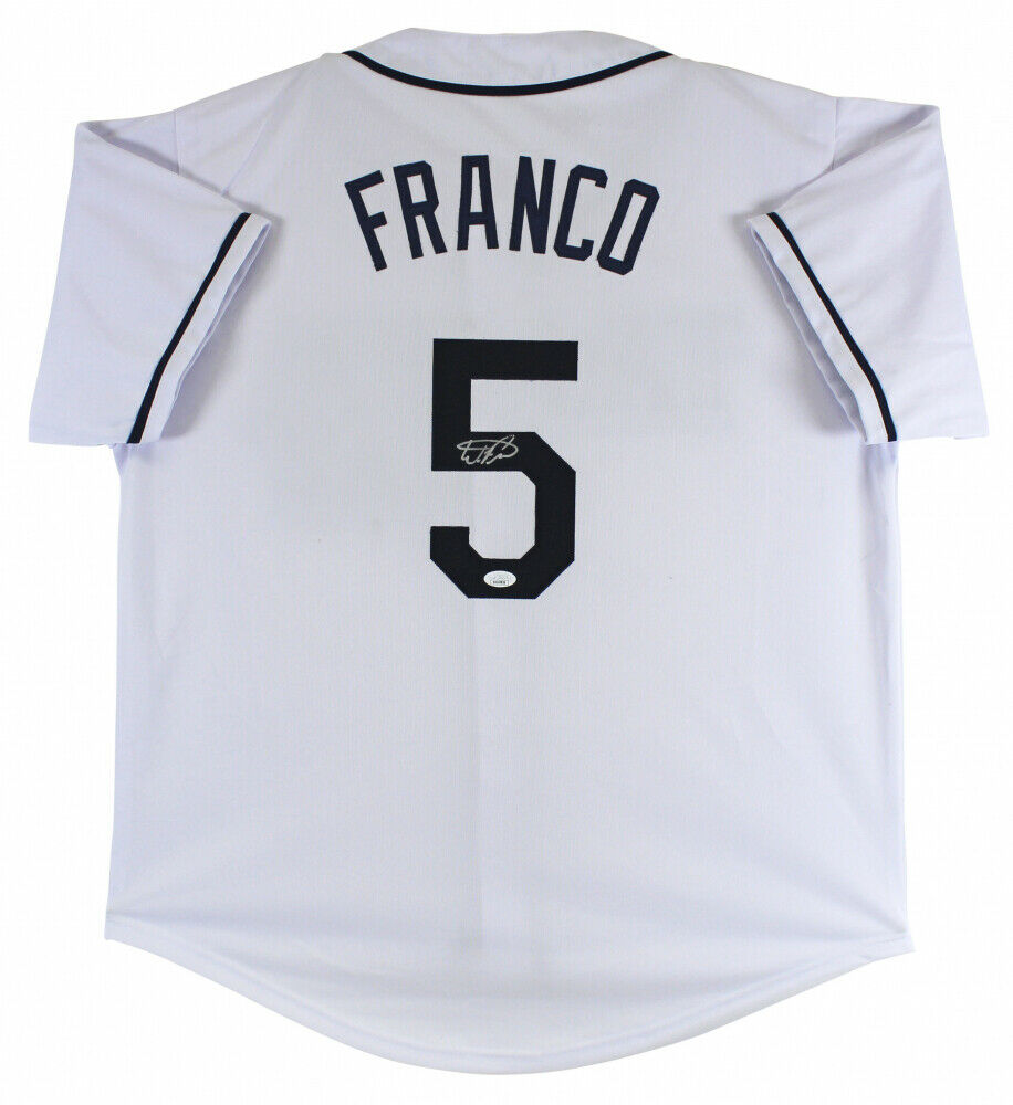Custom on-field style jersey. Everything is sewn on, size XL. Hand-signed by Wander Franco.The autograph(s) includes an official James Spence Authentication (JSA) "Signature Debut" hologram and COA. "Signature Debut" is the autographed memorabilia equivalent to a rookie card. The JSA definition of a "Signature Debut" is as follows: "Any item that is autographed and received by JSA prior to the last game of the signer's official rookie season.Authentication: JSA COACustom on-field style jerseys are a more affordable option for autograph seekers. These jerseys do not have any brand name or tags and are made in the Philippines. They feature stitched on names and numbers and are made to look very similar to the on-field jerseys that the players wear. These custom jerseys are very commonly used in the memorabilia industry.