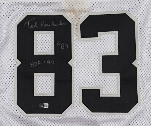 Official Game Wear jersey with everything sewn on, size 2XL. Hand-signed and inscribed by Ted Hendricks (Baltimore Colts, Green Bay Packers, Oakland Raiders, HOF).The autograph includes an official Beckett Authentication Services serially numbered hologram for authenticity purposes.Authentication: Beckett Hologram
